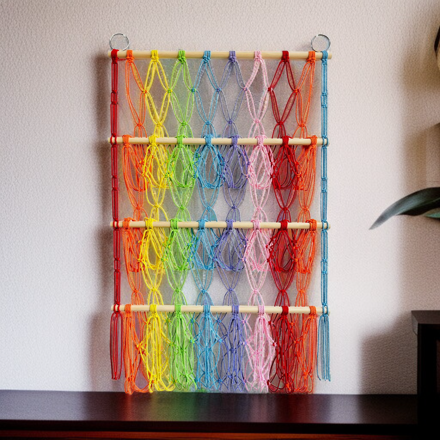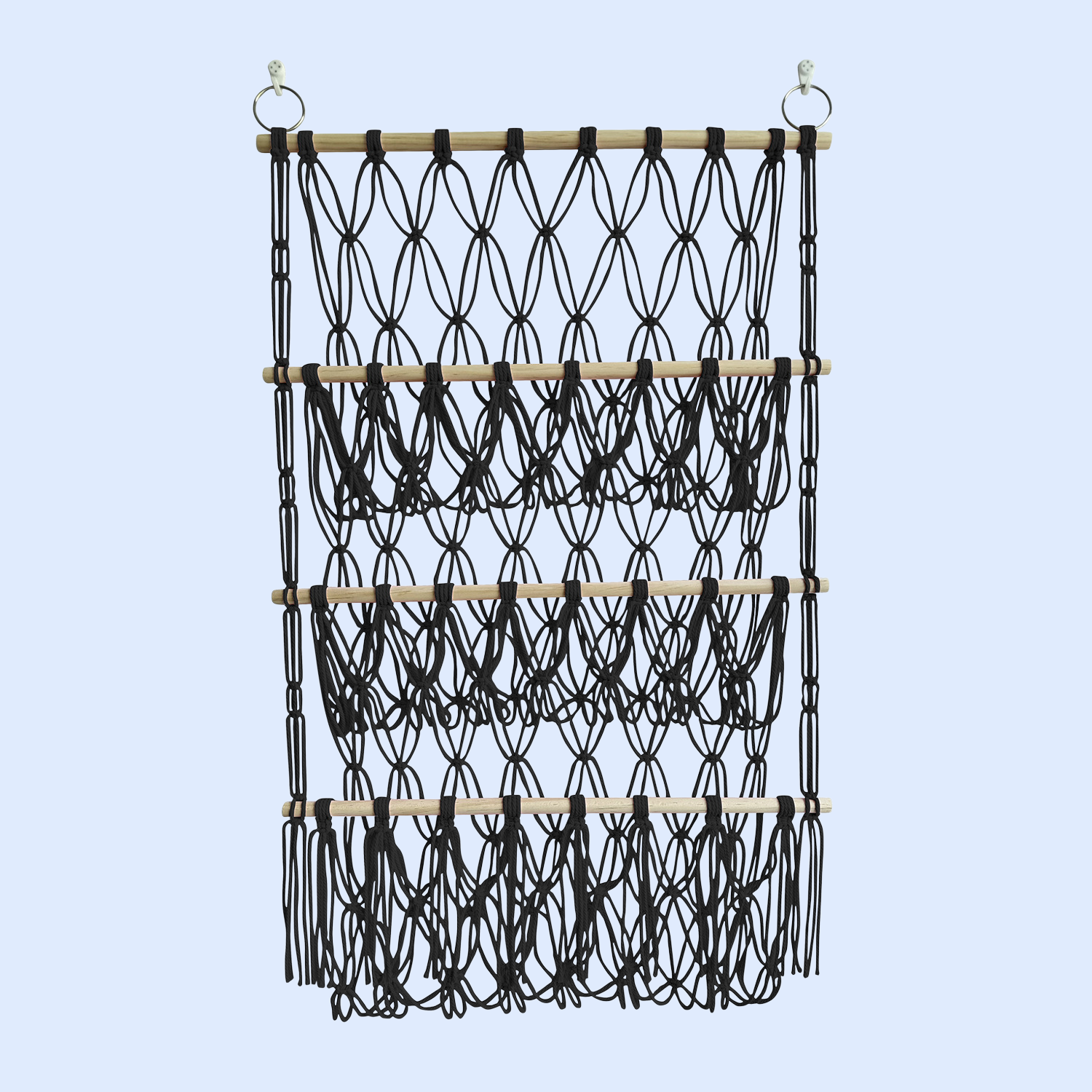 Étagère de rangement à trois niveaux avec filet pour jouets, tiges en bois